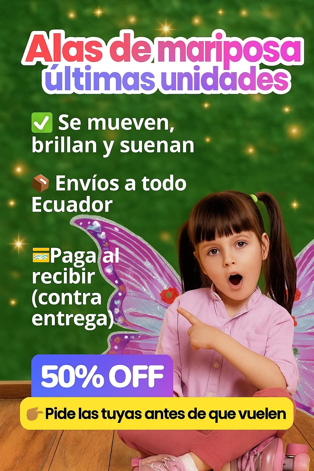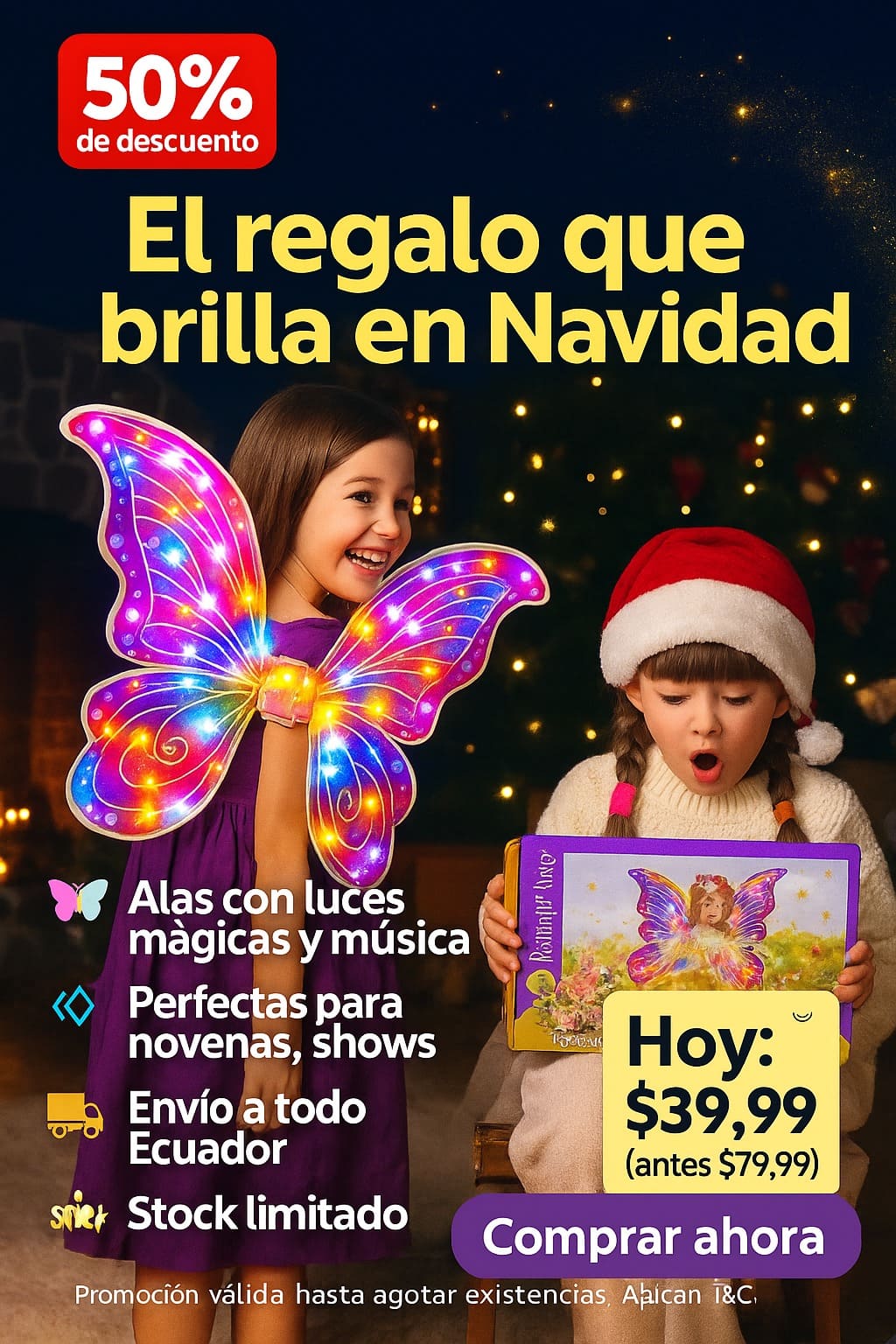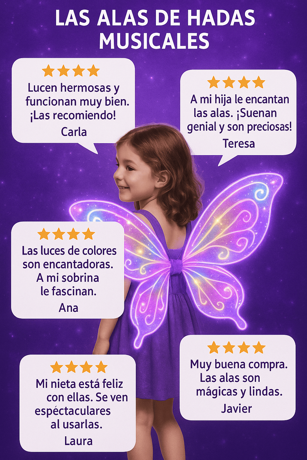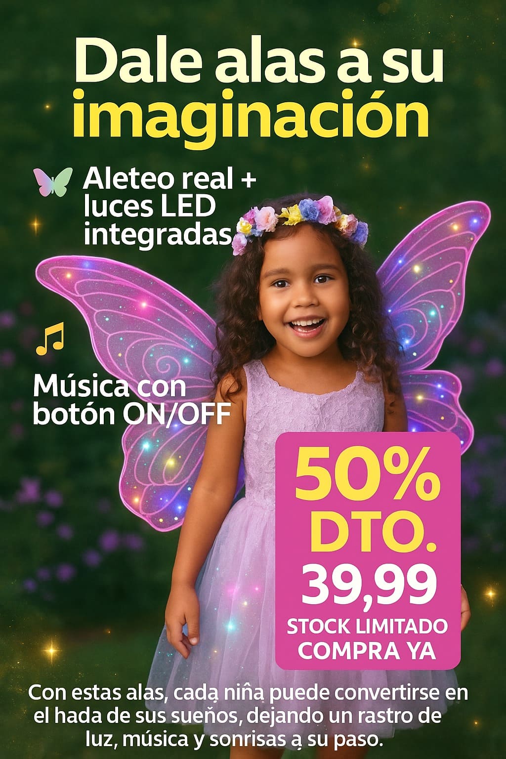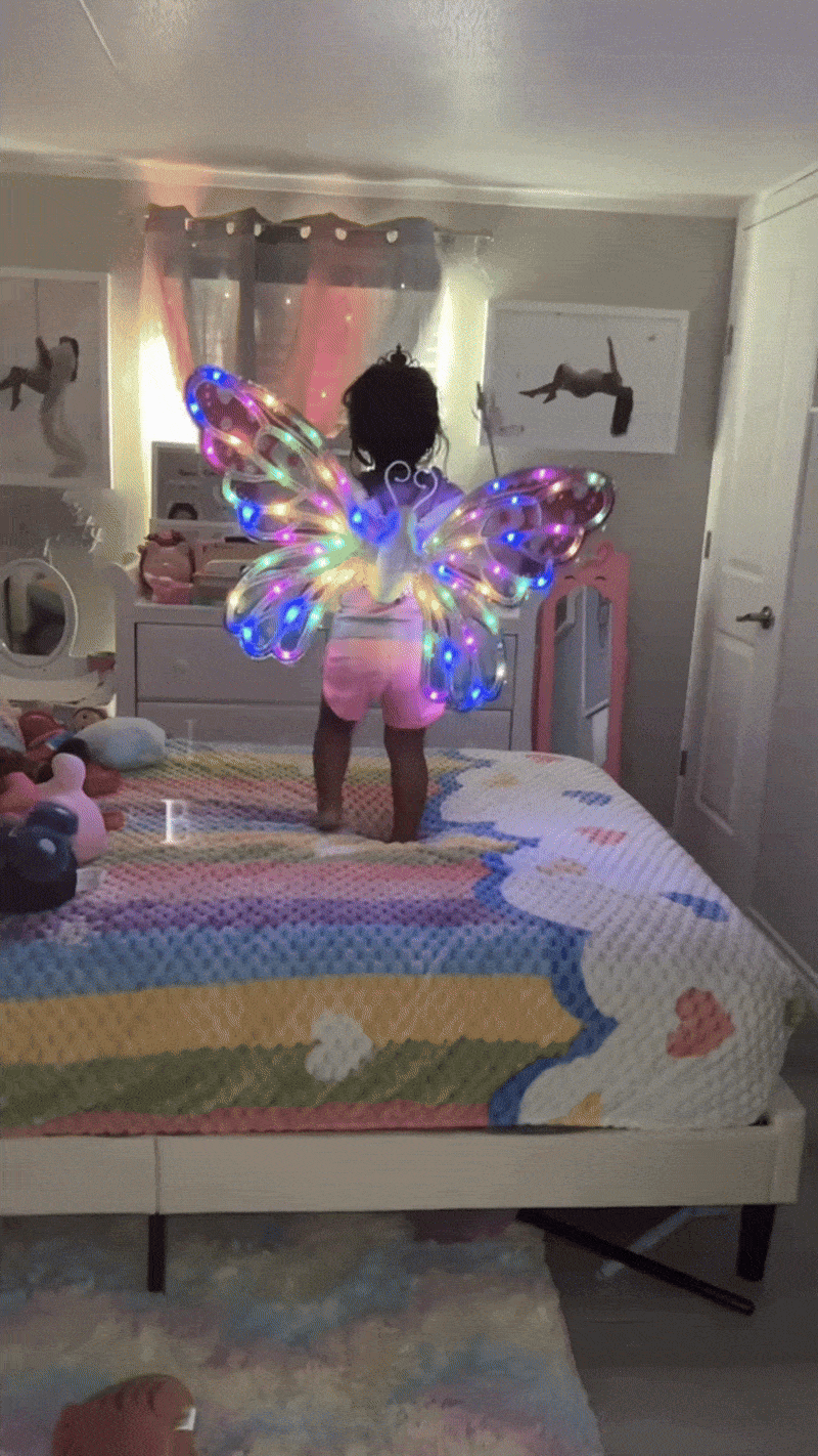 Estas alas se iluminan y reproducen melodías mientras ella juega, baila y sueña como un hada real. 🌈🧚‍♀️