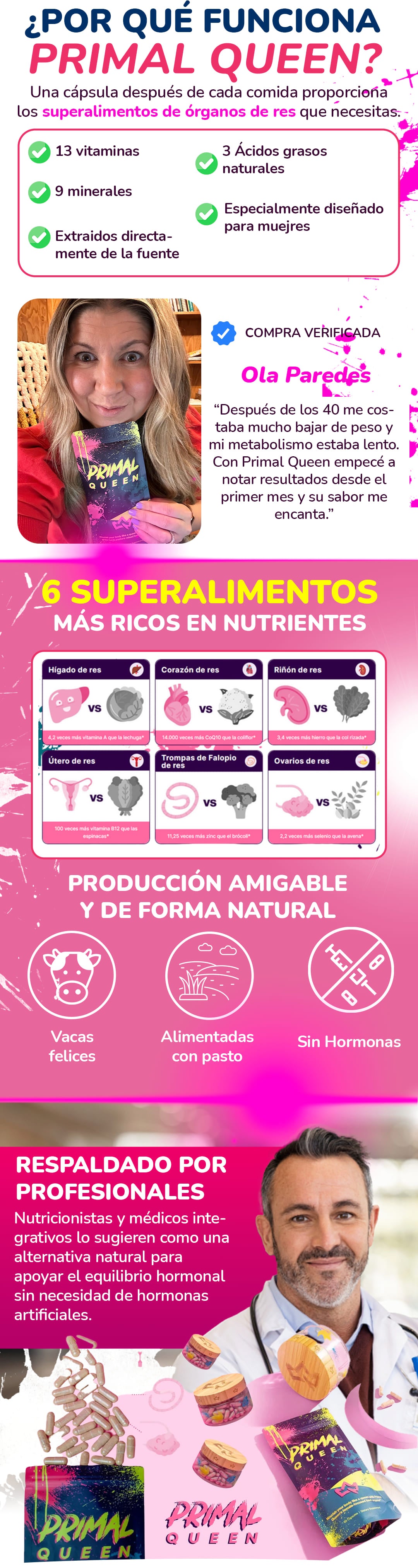 Es un suplemento 100% natural elaborado con órganos de res grass-fed (hígado y ovarios), rico en hierro biodisponible, vitaminas B y zinc, diseñado para apoyar el equilibrio hormonal, aumentar la energía y mejorar el bienestar femenino.