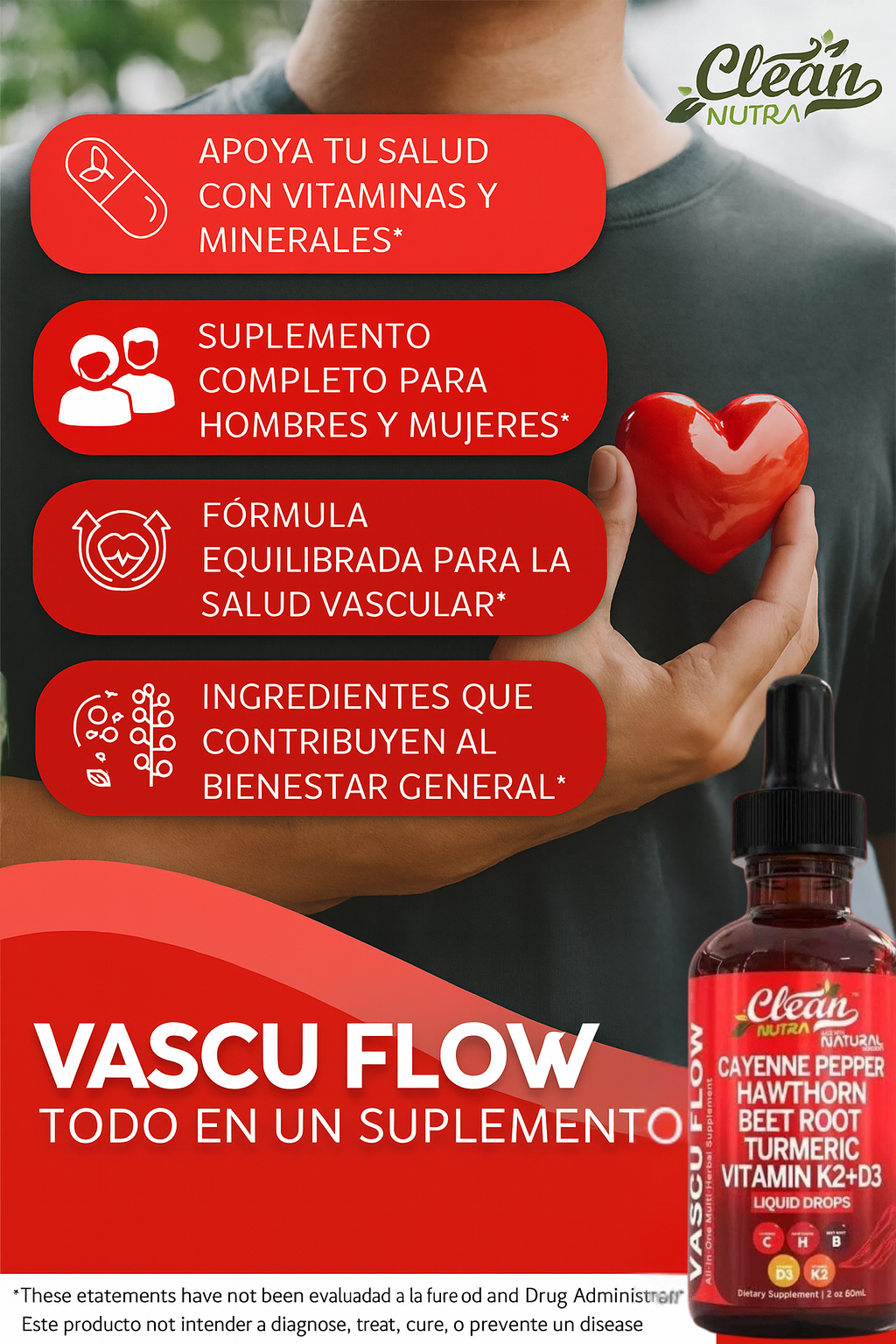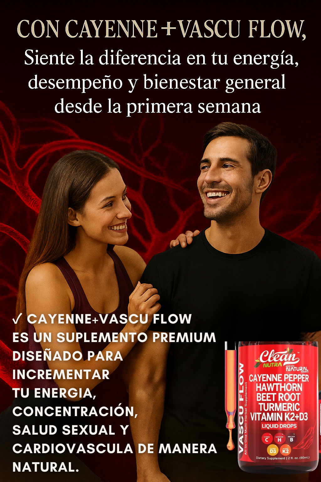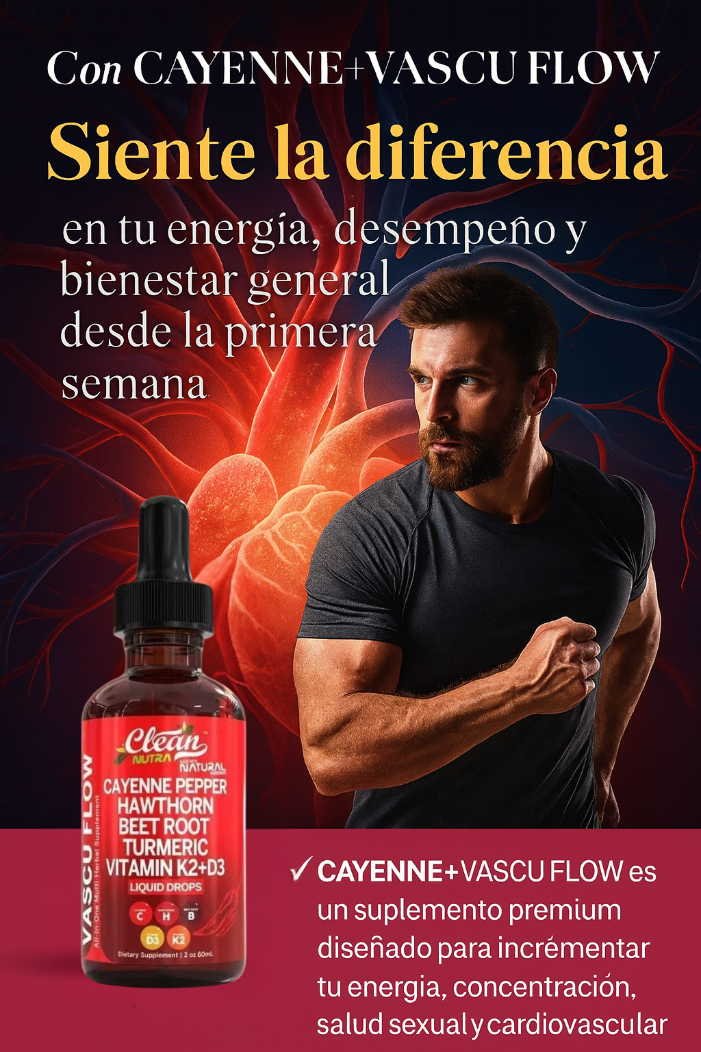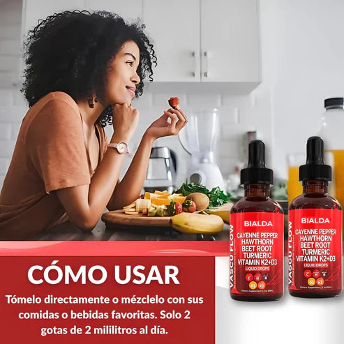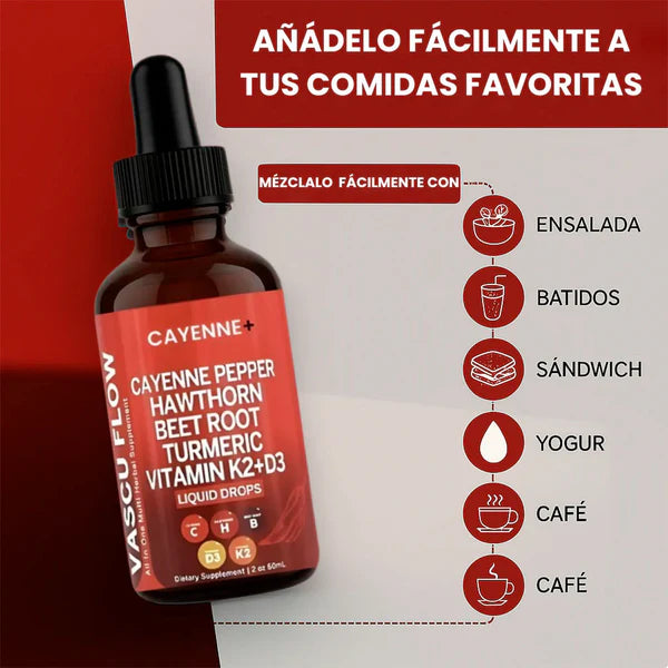 "Una circulación saludable y un flujo sanguíneo equilibrado son esenciales para la vitalidad general. Cayenne+ Vascu Flow apoya estas áreas, ayudando a mejorar la circulación, impulsar la energía y mantener la salud cardíaca de forma natural, permitiéndote mantenerte activo y sentirte en tu mejor estado cada día."