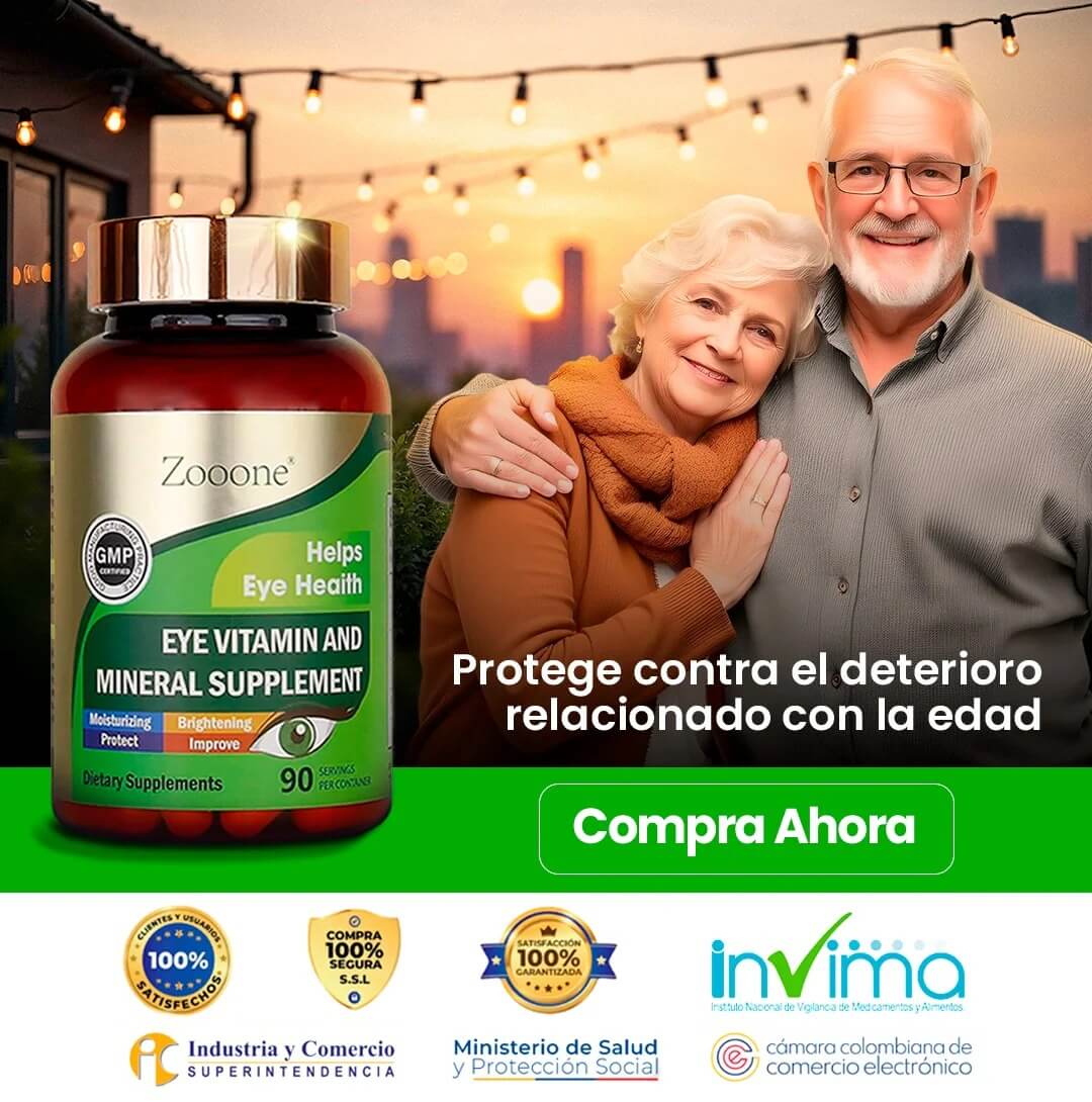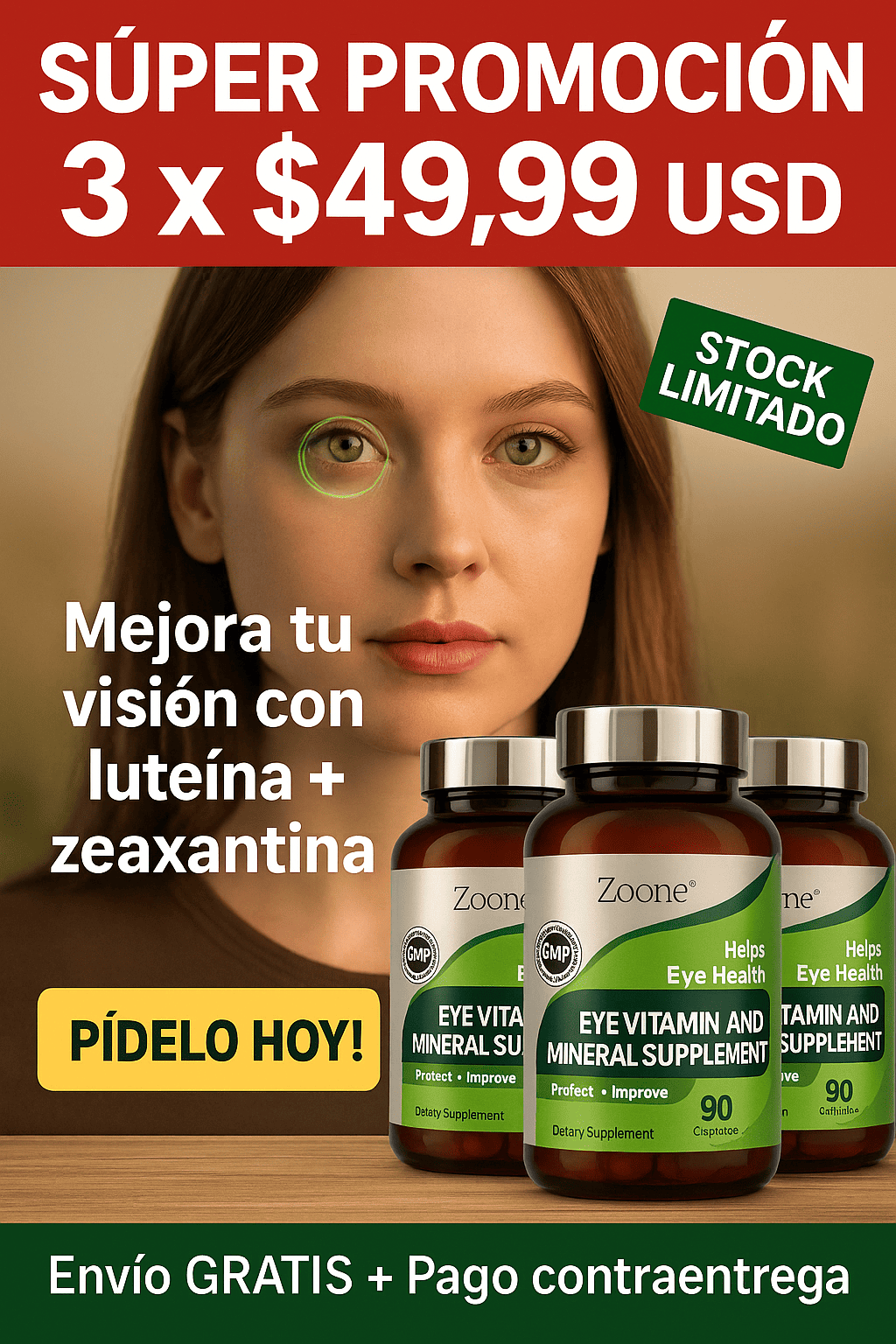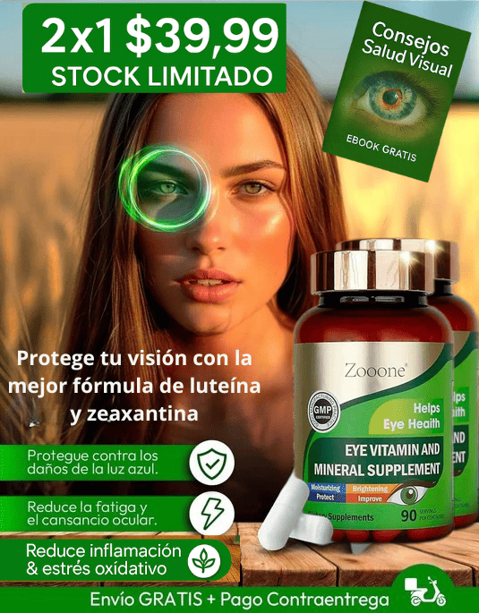 Protege tus ojos y potencia tu salud visual con el Suplemento de Protección y Salud Ocular ZOOONE™, una fórmula natural avanzada diseñada para apoyar la visión, combatir la fatiga ocular y fortalecer tus defensas.